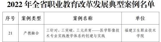 近日,福建省職業(yè)技術(shù)教育中心公布2022年全省職業(yè)教育改革發(fā)展典型案例名單。我校報送的《三針對、三突破、三元共育——醫(yī)學影像技術(shù)專業(yè)實踐教學體系的創(chuàng)建與實踐》案例入選“產(chǎn)教融合”類型典型案例。