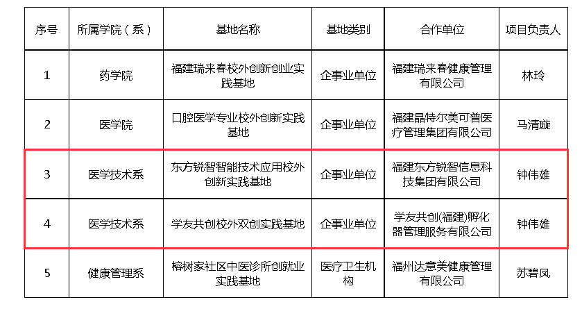 根據(jù)《福建衛(wèi)生職業(yè)技術學院校外創(chuàng)新創(chuàng)業(yè)實踐基地管理辦法(試行)》(閩衛(wèi)院教〔2023〕4 號),學校組織開展2023年度校外創(chuàng)新創(chuàng)業(yè)實踐基地項目評選工作。經(jīng)各學院(系)積極申報,教務處形式審查,專題會議討論并表決通過,我系兩個基地入選建設項目名單。