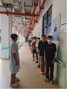 2022年9月9日-18日,在門診部DR室門口,學(xué)生每隔1米整齊列隊,有序等候,他們正在參加我校聯(lián)影醫(yī)學(xué)影像產(chǎn)業(yè)學(xué)院聯(lián)合門診部組織的新生入學(xué)胸片體檢。