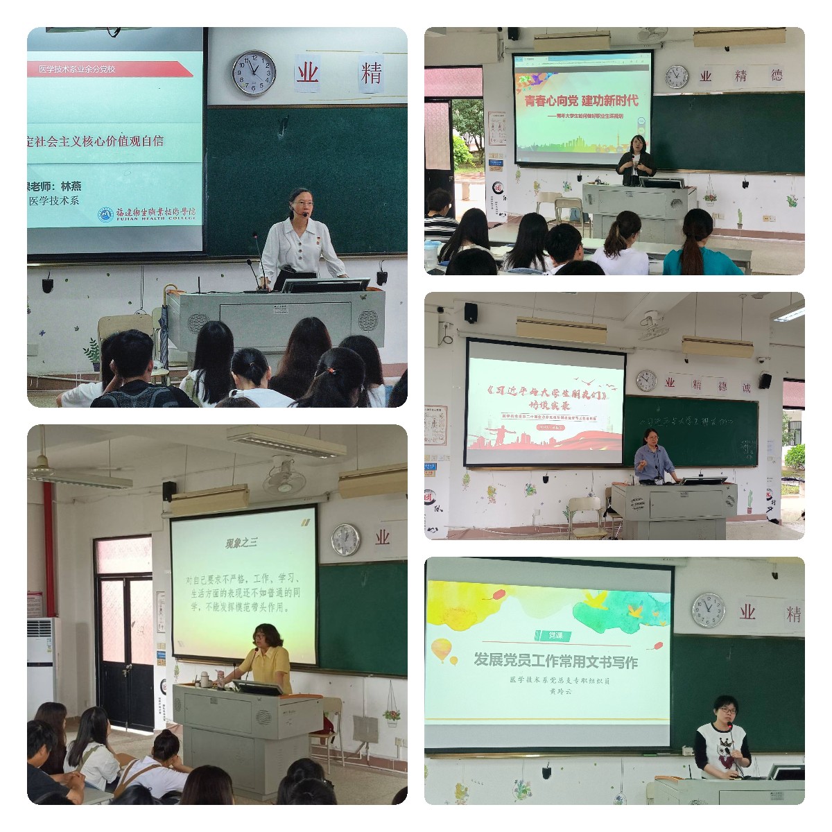 醫(yī)學技術系黨總支副書記林燕圍繞社會主義核心價值觀為學員們上黨課,她強調新時代大學生要重視社會主義核心價值觀的培育,爭做社會主義核心價值觀模范踐行者;黨總支委員陳念文圍繞“怎樣成為一名合格的大學生黨員”主題,站在學生視角,詳細剖析新時代學生黨員的要求;學生第一黨支部書記龍梅梅以《青春心向黨,建功新時代》為題,結合職業(yè)發(fā)展規(guī)劃和就業(yè)指導,引導學員們腳踏實地、以行動入黨;學生第二黨支部書記蔣程序領學《習近平與大學生朋友們》,引導學員們深入感受到人民領袖對青年一代的親切關懷和殷切期望,堅定做一名新時代有志有為青年的信念;黨總支專職組織員黃玲云開展發(fā)展黨員工作常用文書寫作指導,引導學員們及時向黨組織匯報思想動態(tài),積極接受黨組織和培養(yǎng)人的指導意見。