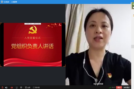 陳俊穎同志代表系黨總支發(fā)言。她對新黨員表示祝賀,并寄語新黨員要把入黨誓詞作為自己的終身實(shí)踐。她寄語新黨員,希望大家在今后工作崗位上自覺接受黨組織的教育、管理和監(jiān)督,不忘初心、牢記使命,用實(shí)際行動為黨旗增輝,為實(shí)現(xiàn)健康中國建設(shè),為實(shí)現(xiàn)“兩個一百年”目標(biāo)而努力奮斗。