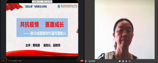6月17日,醫(yī)學(xué)技術(shù)系第十八期業(yè)余分黨校培訓(xùn)班第七課開講,學(xué)院副院長黃銘珊擔(dān)任此次課程的主講人。本次課程的主題為“共抗疫情,醫(yī)路成長——奮斗成就新時(shí)代最可愛的人”。她為同學(xué)們深入介紹了在黨中央的統(tǒng)一領(lǐng)導(dǎo)與精準(zhǔn)施策下,全國人民眾志成城,我國疫情防控取得了階段性勝利,分享了奮斗在抗疫一線先鋒人物的典型事跡。黃銘珊副院長深情勉勵(lì)同學(xué)們,希望大家作為青年一代要有責(zé)任、有擔(dān)當(dāng)、有使命,銘記“業(yè)精德誠”校訓(xùn)精神,勤學(xué)苦練,勵(lì)志奉獻(xiàn),用過硬本領(lǐng)承擔(dān)起新時(shí)代賦予的責(zé)任。