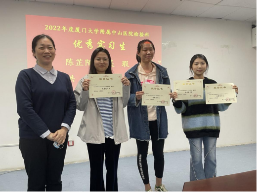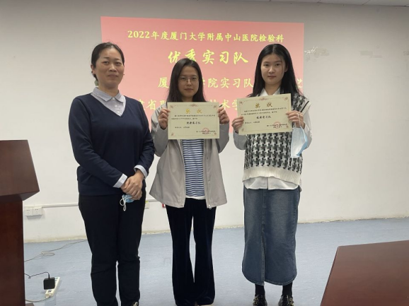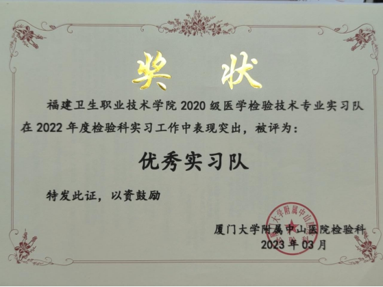2023年3月30日,廈門大學附屬中山醫(yī)院檢驗科為2023屆實習生舉辦表彰大會,福建衛(wèi)生職業(yè)技術學院檢驗專業(yè)實習隊獲得“優(yōu)秀實習隊”稱號,20檢驗301班洪馨同學與20檢驗303班吳瑕同學獲評“優(yōu)秀實習生”。
