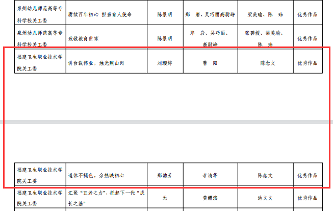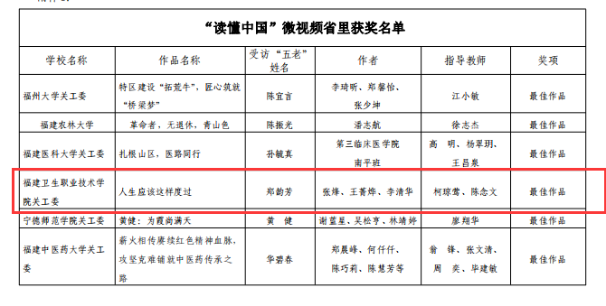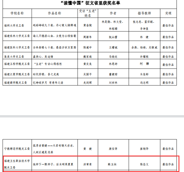 近日,福建省教育系統(tǒng)關(guān)工委公布了2022年“讀懂中國”活動評審結(jié)果。本次省教育關(guān)工委共評選最佳征文10篇,優(yōu)秀征文47篇,最佳微視頻6個,優(yōu)秀微視頻20個。我系選送的微視頻《人生應(yīng)該這樣度過》獲評福建省教育關(guān)工委2022年“讀懂中國”活動微視頻最佳作品;選送的3篇征文均獲佳績,征文《他種下一顆種子,后來碩果累累》獲評最佳作品,《講臺載偉業(yè),燭光照山河》《退休不褪色,余熱映初心》兩篇征文獲評優(yōu)秀作品。