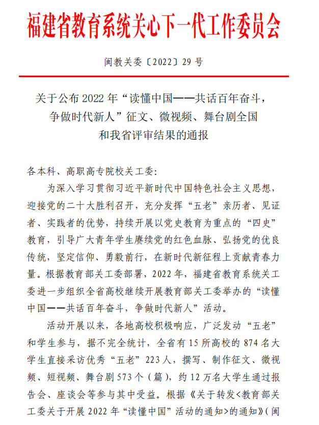 喜報|我系多項作品在福建教育系統(tǒng)關(guān)工委2022年“讀懂中國”活動中榮獲佳績