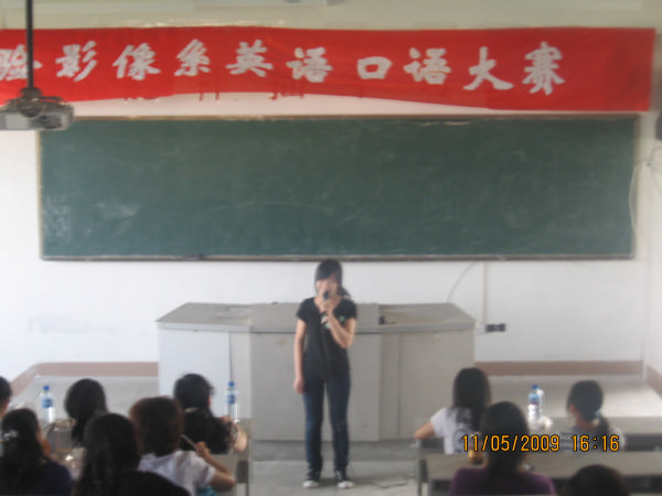 為響應(yīng)學(xué)院藝術(shù)節(jié)號召,檢驗影像系于2009年5月12日下午在系部第2階梯教室舉行英語口語演講比賽。擔(dān)任此次比賽的評委是英語教研組的曹周英老師、張東方老師、李園源老師等九位老師。