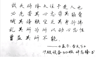 筆走乾坤恢弘氣,墨染中華四時(shí)春。在這萬物復(fù)蘇的時(shí)節(jié),我們用書法傳遞信仰,一筆一劃勾勒萬千江山。在書法中傳承中華文化,領(lǐng)會(huì)習(xí)近平語錄,弘揚(yáng)國粹魅力,同學(xué)們的藝術(shù)修養(yǎng)和審美情操在學(xué)思踐悟中不忘初心,牢記使命,綿綿用力繪藍(lán)圖、久久為功筑夢想,讓我們把新的時(shí)代答卷書寫得更扎實(shí)、更精彩!