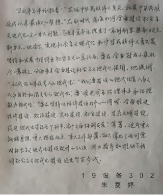 活動(dòng)采取了軟筆和硬筆兩種形式,我系學(xué)生積極踴躍地參加,共收到七十余份作品。參賽作品都個(gè)性十足,抬手提筆,盡其所能地展示自身書法才能,或蒼勁有力、或飄逸清秀,一筆一劃間都彰顯著漢字的獨(dú)特魅力,充滿了對習(xí)近平新時(shí)代中國特色社會(huì)主義思想的歌頌與弘揚(yáng)。經(jīng)系部嚴(yán)格篩選、反復(fù)斟酌,選出軟筆和硬筆各五幅優(yōu)秀作品,進(jìn)行展示。