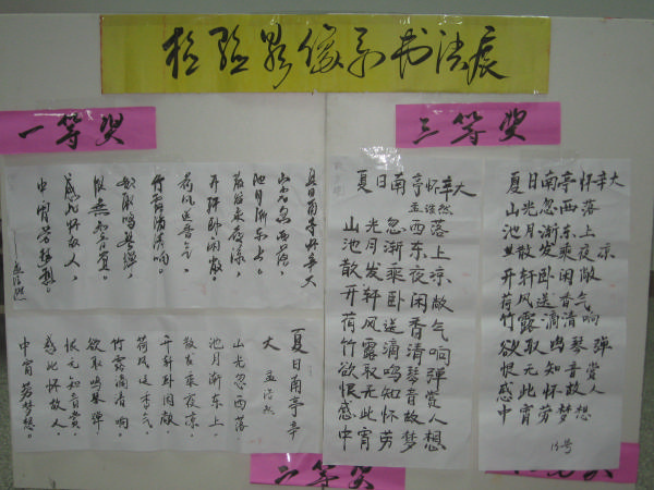 為豐富同學(xué)們的課余活動,提高對中國書法的鑒賞能力,同時發(fā)掘系部書法方面的優(yōu)秀人才,檢驗影像系于2007年10月11日下午4:00在系二階舉行書法比賽。本次比賽共收到參賽作品50余件,其參賽作品之多,書法技藝之高超,令評委驚喜。經(jīng)過評委的認(rèn)真評選,最終選出一等獎2名,二等獎4名,三等獎6名,優(yōu)秀獎8名,而所有獲獎?wù)叨紝@得相應(yīng)的素質(zhì)拓展加分。