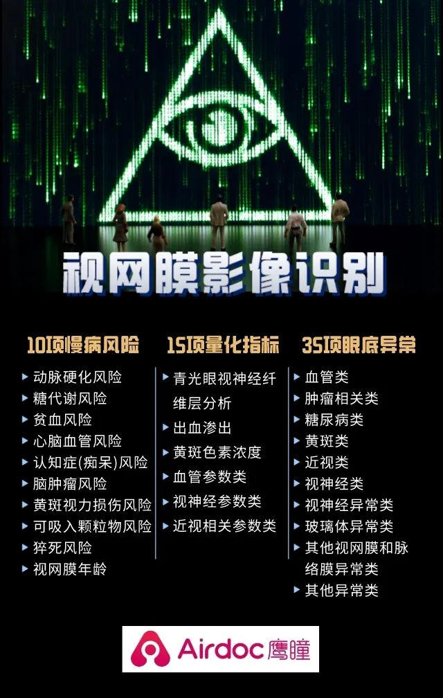 僅需30秒到1分鐘,一張張眼底視網(wǎng)膜照片,就從一臺(tái)白色的便攜式眼底相機(jī)傳送至AI人工智能云平臺(tái)。通過視網(wǎng)膜影像識(shí)別,鷹瞳Airdoc創(chuàng)新AI慢病風(fēng)險(xiǎn)評(píng)估與眼底疾病診斷技術(shù),即可逐一為受檢者詳細(xì)分析10項(xiàng)健康風(fēng)險(xiǎn)評(píng)估+15項(xiàng)量化指標(biāo)+35項(xiàng)眼底異常。