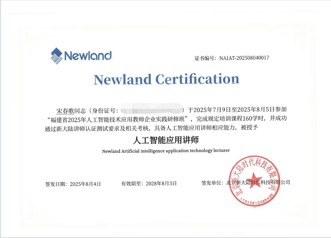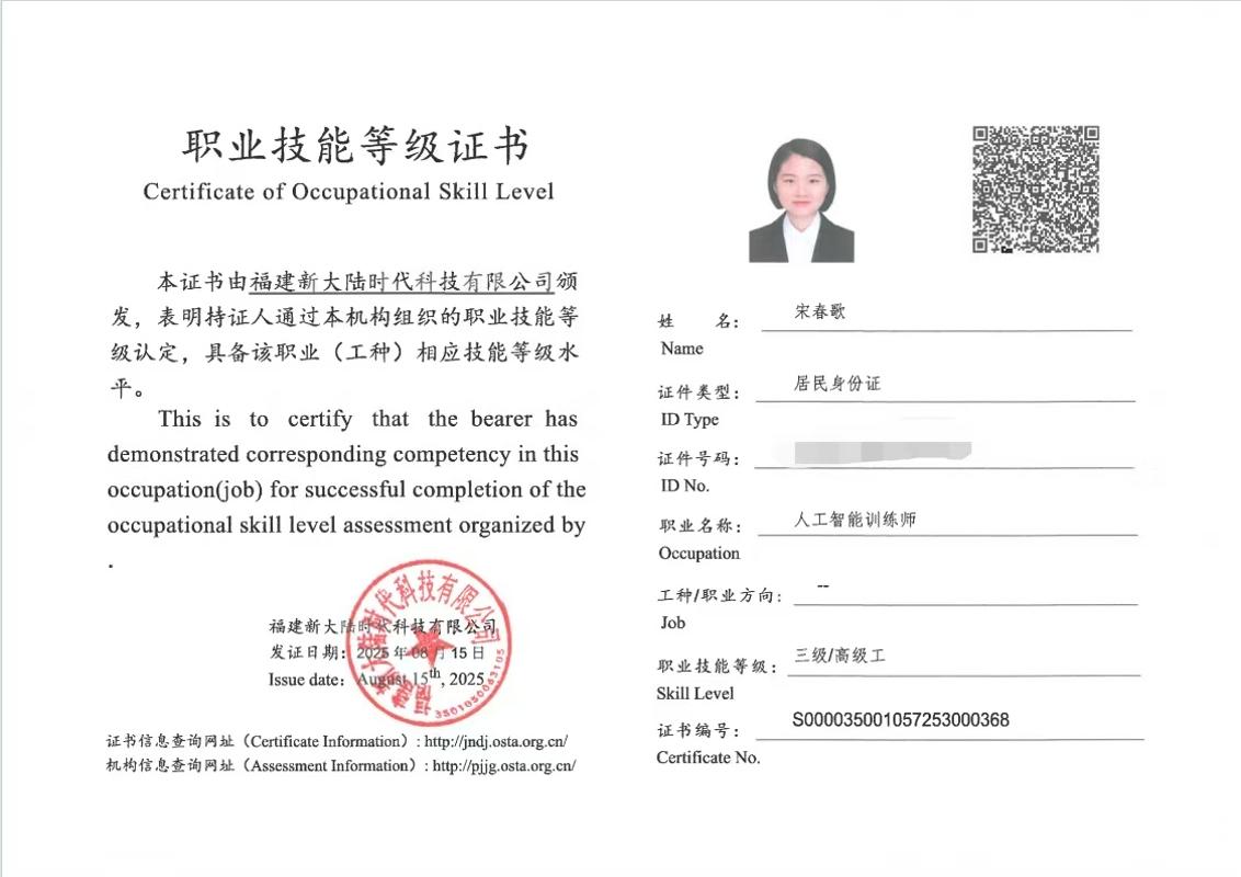 值得一提的是,在嚴(yán)格考核后,宋春歌老師獲得了由新大陸科技有限公司頒發(fā)的“人工智能訓(xùn)練師(三級)”證書及“人工智能應(yīng)用講師”證書。雙重認(rèn)證不僅是對教師技術(shù)能力與教學(xué)能力的權(quán)威認(rèn)可,也為職業(yè)院校申報“雙師型”教師、優(yōu)化專業(yè)師資結(jié)構(gòu)提供了有力支撐。