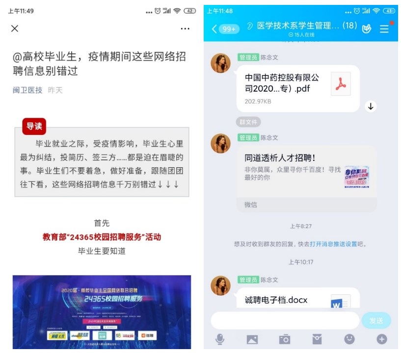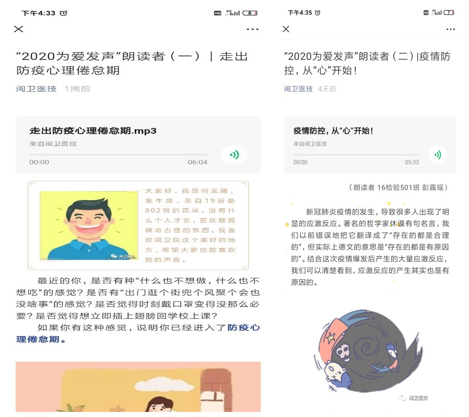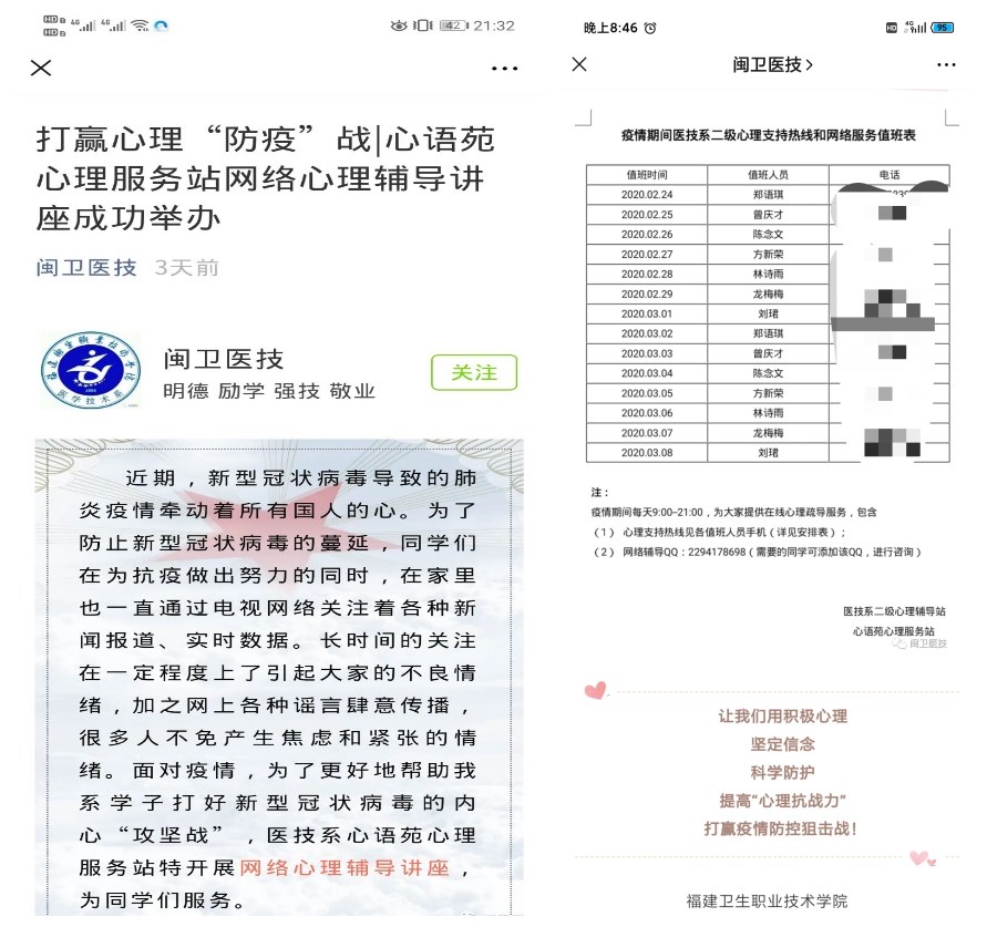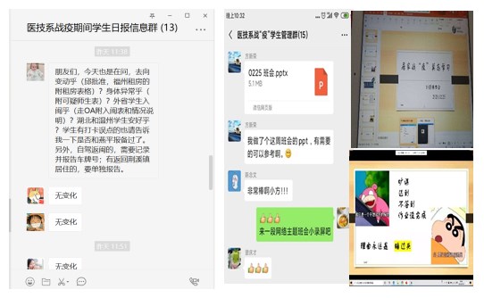 疫情發(fā)生以來(lái),醫(yī)技系學(xué)生管理一手抓學(xué)生疫情摸排信息,一手抓學(xué)生各項(xiàng)常規(guī)工作。面向不同類(lèi)型的困難學(xué)生,力求做到個(gè)性化幫扶、人性化關(guān)愛(ài)。針對(duì)家庭經(jīng)濟(jì)困難學(xué)生,輔導(dǎo)員注重解決思想問(wèn)題與解決實(shí)際問(wèn)題相結(jié)合,積極幫助符合條件的學(xué)生申請(qǐng)“防疫期間臨時(shí)困難補(bǔ)助”,及時(shí)送上經(jīng)濟(jì)關(guān)懷;持續(xù)推進(jìn)畢業(yè)班的就業(yè)指導(dǎo)和服務(wù)工作,在班級(jí)群及時(shí)推送各類(lèi)網(wǎng)絡(luò)就業(yè)招聘會(huì)信息和企業(yè)招聘信息,助推應(yīng)屆畢業(yè)生就業(yè)工作,為家庭經(jīng)濟(jì)困難同學(xué)提供“網(wǎng)絡(luò)流量資費(fèi)資助”,緩解應(yīng)屆畢業(yè)生的生活壓力;針對(duì)心理“防疫”,醫(yī)技系心理輔導(dǎo)站將學(xué)生心理健康納入整體防控工作,開(kāi)通疫情期間心理支持熱線(xiàn)和網(wǎng)絡(luò)服務(wù),邀請(qǐng)臨床心理醫(yī)生開(kāi)展“新冠肺炎疫情下的心理援助熱線(xiàn)原則及方法”線(xiàn)上培訓(xùn),策劃心言心語(yǔ)系列活動(dòng)之“2020為愛(ài)發(fā)聲”朗讀者聲音療愈計(jì)劃,發(fā)揮“朋輩心理輔導(dǎo)”作用,切實(shí)做到抗“疫”與暖心并舉、防疫與育人結(jié)合。