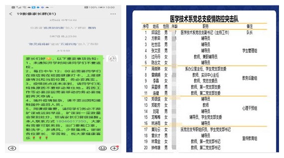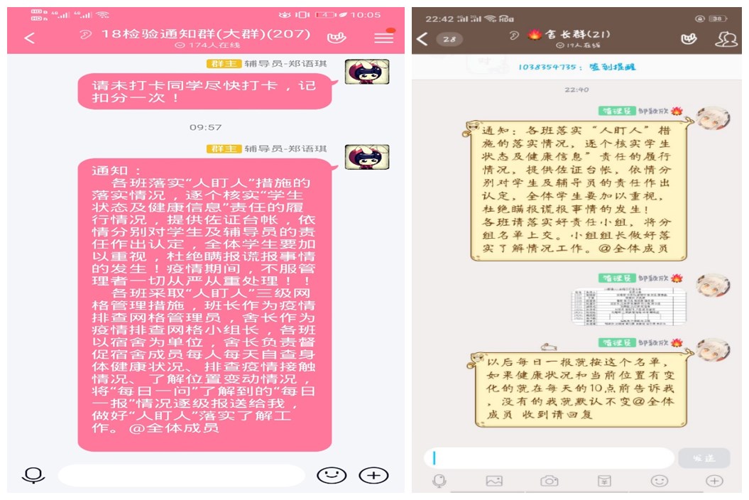 新冠肺炎疫情發(fā)生以來(lái),醫(yī)學(xué)技術(shù)系成立黨員醫(yī)學(xué)技術(shù)系黨總支疫情防控黨員突擊隊(duì),并由一線(xiàn)輔導(dǎo)員組成學(xué)生管理組,組織力量開(kāi)展防控,依法依規(guī)有序管控。構(gòu)建學(xué)生“系部—輔導(dǎo)員—班級(jí)”預(yù)防控制體系,創(chuàng)建“人盯人”三級(jí)網(wǎng)格管理模式,充分調(diào)動(dòng)并發(fā)揮黨員骨干、學(xué)生干部、舍長(zhǎng)等力量與作用。以輔導(dǎo)員為一級(jí)網(wǎng)格,班長(zhǎng)為二級(jí)網(wǎng)格,舍長(zhǎng)為三級(jí)網(wǎng)格,每一個(gè)班級(jí)參照網(wǎng)格管理制度設(shè)立以宿舍為單位的網(wǎng)格,將舍長(zhǎng)設(shè)置為疫情排查網(wǎng)格管理員。重點(diǎn)對(duì)象采用一對(duì)一、多對(duì)一的舉措,每天由舍長(zhǎng)上報(bào)宿舍成員的去向及健康狀況,保證逐個(gè)落實(shí)、實(shí)時(shí)掌控。明確每一層級(jí)具體負(fù)責(zé)人,嚴(yán)格落實(shí)疫情信息逐級(jí)報(bào)告制度;為確?!翱?、準(zhǔn)、穩(wěn)”掌握學(xué)生動(dòng)態(tài)情況,做到不留糊涂賬、不打無(wú)底仗,醫(yī)技系輔導(dǎo)員以點(diǎn)帶面,織網(wǎng)管理,借助視頻、語(yǔ)音等多種途徑,通過(guò)見(jiàn)真人、聽(tīng)原聲、察實(shí)情的形式,精準(zhǔn)系統(tǒng)把握學(xué)生的信息和健康狀況,切實(shí)做到防控工作的橫向到邊、縱向到底,不留死角;每周開(kāi)展線(xiàn)上班會(huì),向?qū)W生反復(fù)強(qiáng)調(diào)未接到學(xué)校返校通知一律不得提前返校,教育學(xué)生以居家為主,盡量減少出門(mén),減少與人接觸,無(wú)特殊原因不要擅自離開(kāi)現(xiàn)居住地;加強(qiáng)對(duì)實(shí)習(xí)生的管理,要求不得擅自返回實(shí)習(xí)地,對(duì)特殊原因需提前返程在校外租住的實(shí)習(xí)生進(jìn)行實(shí)時(shí)監(jiān)測(cè);加強(qiáng)與學(xué)生家長(zhǎng)的溝通,暢通家校聯(lián)系途徑。輔導(dǎo)員明確將不得提前返校、做好線(xiàn)上教學(xué)準(zhǔn)備等要求告知家長(zhǎng),做到重要信息雙線(xiàn)并聯(lián)推送,充分發(fā)揮學(xué)生家長(zhǎng)的強(qiáng)心劑作用,共同把好學(xué)生健康關(guān)、學(xué)習(xí)關(guān)。