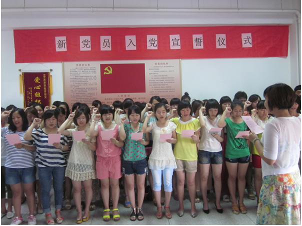 鮮紅的黨旗,簡(jiǎn)而有力地為現(xiàn)場(chǎng)渲染出莊重的氣氛,此次宣誓儀式由系黨總支副書(shū)記蘇愛(ài)華主持。何舒瀾老師宣布新黨員名單,同學(xué)們認(rèn)真關(guān)注,當(dāng)聽(tīng)到自己的名字時(shí)臉上露出了喜悅的笑容。鄭煒老師帶領(lǐng)大家面向黨旗莊嚴(yán)宣誓:“我志愿加入中國(guó)共產(chǎn)黨……”每個(gè)同學(xué)都用發(fā)自?xún)?nèi)心的聲音抒發(fā)對(duì)黨忠誠(chéng)的決心,面對(duì)著黨旗,大家接受了一次全身心的特殊洗禮。蘇愛(ài)華老師在儀式上對(duì)全體新黨員同志提出了很多要求和建議:新黨員要做好模范帶頭作用,爭(zhēng)取在學(xué)習(xí)、生活各方面為全體同學(xué)樹(shù)立榜樣。最后,奏響了《國(guó)際歌》,結(jié)束了此次的宣誓儀式。
