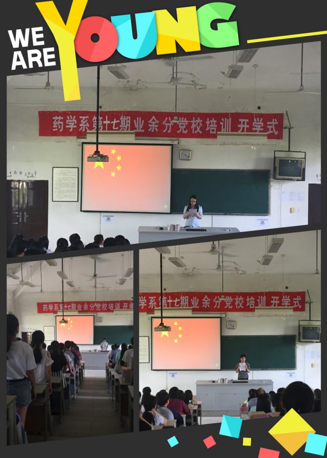 2016年5月3日,藥學(xué)系第十七期業(yè)余分黨校開班典禮在藥二階隆重舉行。藥學(xué)系黨總支蘇愛華書記、第二黨支部書記何舒瀾老師、學(xué)生黨支部書記陳瑜老師、團(tuán)總支書記李寶珠老師、團(tuán)總支副書記黃嵩梅老師以及輔導(dǎo)員蘇素嬌老師、陳翰老師出席了本次開班典禮。