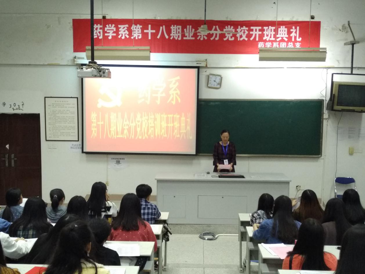 2016年11月8日,藥學(xué)系第十八期業(yè)余分黨校開(kāi)班典禮在藥二階隆重舉行,蒞臨本次大會(huì)的系領(lǐng)導(dǎo)老師有:藥學(xué)系黨總支蘇愛(ài)華書(shū)記、林燕副書(shū)記、藥學(xué)系第一黨支部書(shū)記葉雅沁老師、藥學(xué)系第二黨支部書(shū)記何舒瀾老師、學(xué)生黨支部書(shū)記陳瑜老師以及藥學(xué)系團(tuán)總支書(shū)記李寶珠老師和團(tuán)副書(shū)記黃嵩梅老師。