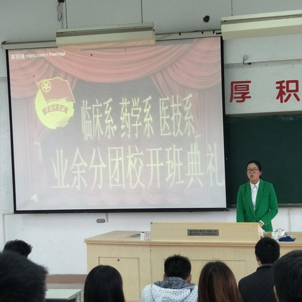 本次開班典禮共分為三個議程:首先全體人員起立,奏唱國歌;接著由臨床醫(yī)學系團總支書記葉家濤上臺宣讀本期業(yè)余分團校學員名單;最后,醫(yī)學技術系團總支書記楊盈老師上臺發(fā)言,對本期團校學員提出要求和期盼。她要求學員樹立正確的思想,切實行動;希望每一位同學都可以在本次團?;顒又惺斋@滿滿,早日成為一名合格的共青團員。