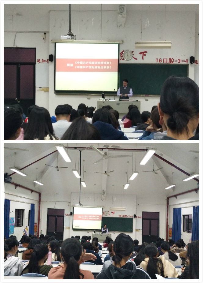 2017年12月5日,藥學(xué)系第二黨支部書記何舒瀾老師在教學(xué)樓310為第二十期業(yè)余分黨校學(xué)員們解讀《中國共產(chǎn)黨廉潔自律準(zhǔn)則》和《中國共產(chǎn)黨紀(jì)律處分條例》。