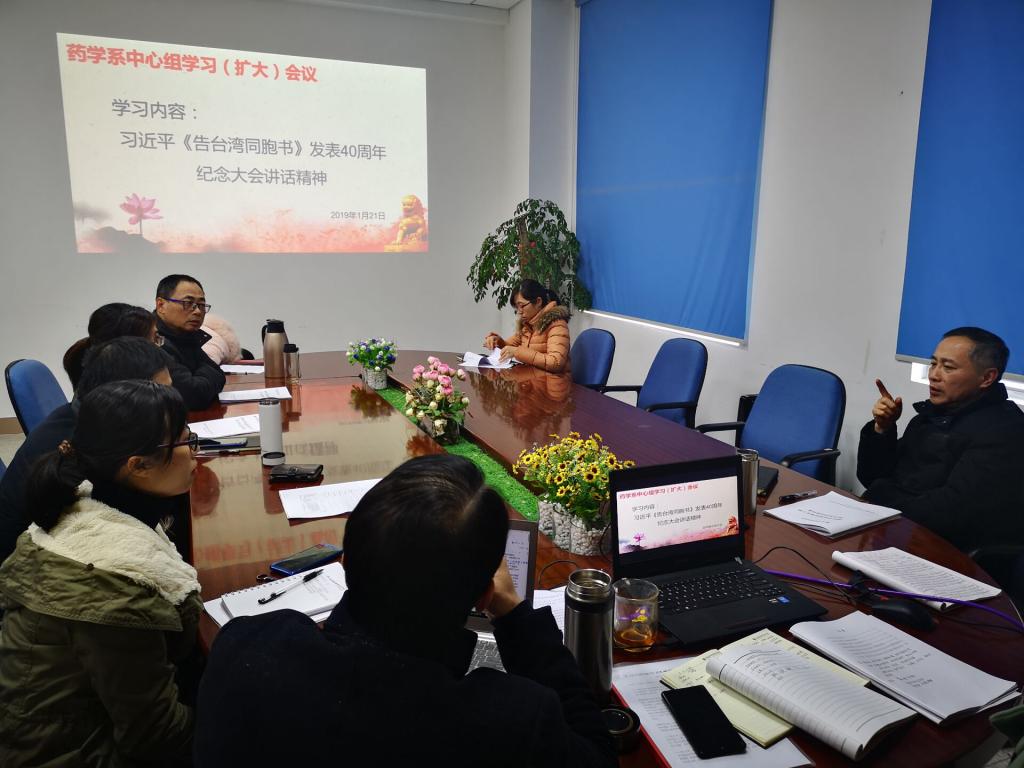 1月21日,藥學(xué)系組織中心組學(xué)習(xí)(擴(kuò)大)會(huì),主要學(xué)習(xí)習(xí)近平總書記在《告臺(tái)灣同胞書》發(fā)表40周年紀(jì)念大會(huì)講話精神。學(xué)習(xí)會(huì)由總支副書記陳潔主持,班子成員、總支委員、支部書記及團(tuán)總支書記參加了此次學(xué)習(xí)。
