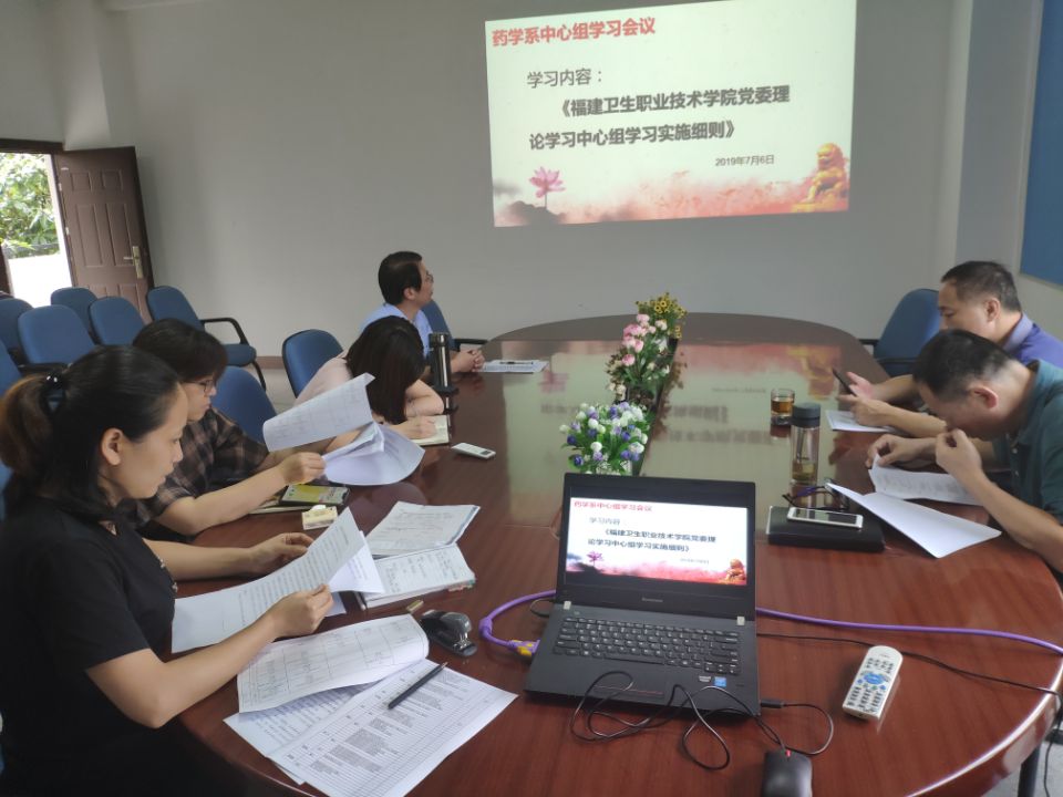 2019年7月6日,藥學(xué)系中心組(擴(kuò)大)于會(huì)議室學(xué)習(xí)《福建衛(wèi)生職業(yè)技術(shù)學(xué)院黨委理論學(xué)習(xí)中心組學(xué)習(xí)實(shí)施細(xì)則》(以下簡(jiǎn)稱“細(xì)則”),會(huì)議由藥學(xué)系黨總支鄭力宏書記主持。