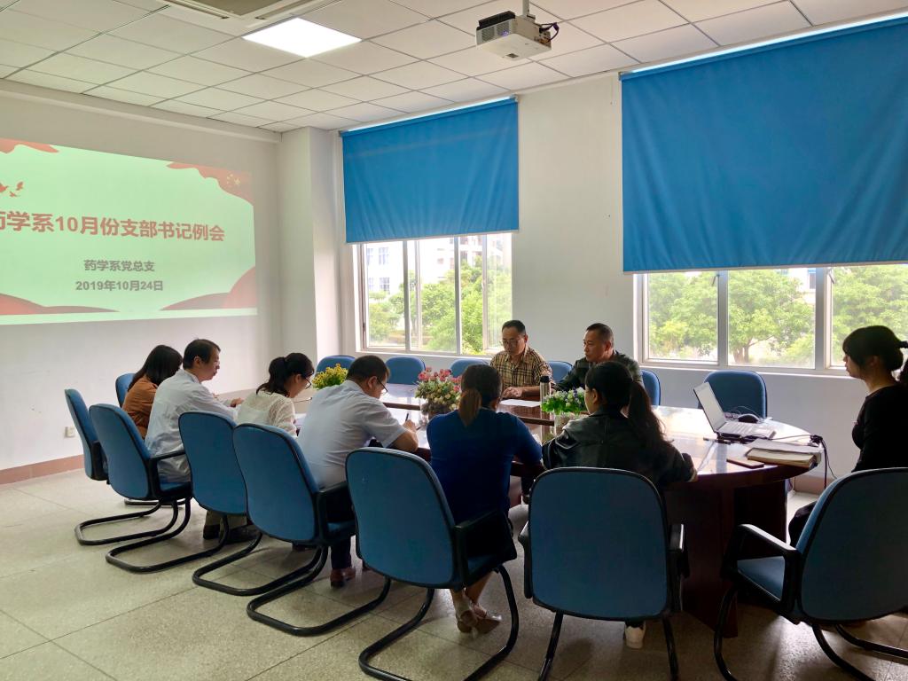 2019年10月24日,藥學系黨總支在會議室召開10月份支部書記例會,會議由藥學系黨總支書記鄭力宏同志主持。
