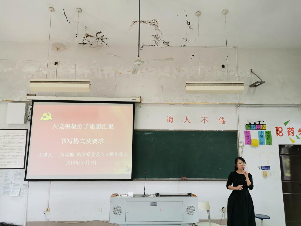 為進(jìn)一步規(guī)范學(xué)員們書(shū)寫(xiě)思想?yún)R報(bào)的內(nèi)容及格式,2019年10月24日,藥學(xué)系于藥二階開(kāi)展第二十二期業(yè)余分黨校專(zhuān)題培訓(xùn),本次培訓(xùn)主題是“入黨積極分子思想?yún)R報(bào)書(shū)寫(xiě)格式及要求”,由藥學(xué)系黨總支專(zhuān)職組織員黃嵩梅老師主講。