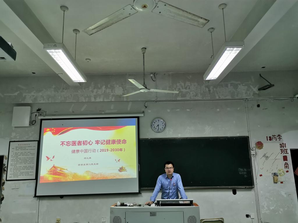 鄧元榮老師首先為學(xué)員們解答了什么是“健康中國(guó)行動(dòng)”;圍繞“實(shí)施健康中國(guó)戰(zhàn)略”在新時(shí)代中國(guó)特色社會(huì)主義事業(yè)中的重要意義和作用、“實(shí)施健康中國(guó)戰(zhàn)略”的核心要義和基本思路、解析”實(shí)施健康中國(guó)戰(zhàn)略”、把"實(shí)施健康中國(guó)戰(zhàn)略”重點(diǎn)任務(wù)落到實(shí)處、“健康中國(guó)2030"規(guī)劃綱要等五方面內(nèi)容展開(kāi)論述。他指出:我們的初心和使命就是不忘救死扶傷的初心,牢記為人類(lèi)除病痛、助健康的使命,藥學(xué)系青年學(xué)子要帶頭踐行誓言,為健康中國(guó)奉獻(xiàn)力量。最后,鄧?yán)蠋熛M麑W(xué)員們堅(jiān)定信念,改革創(chuàng)新,奮發(fā)圖強(qiáng),努力維護(hù)人民群眾的健康,讓全體人民以更加健康的姿態(tài),邁向中國(guó)特色社會(huì)主義建設(shè)的新時(shí)代。
