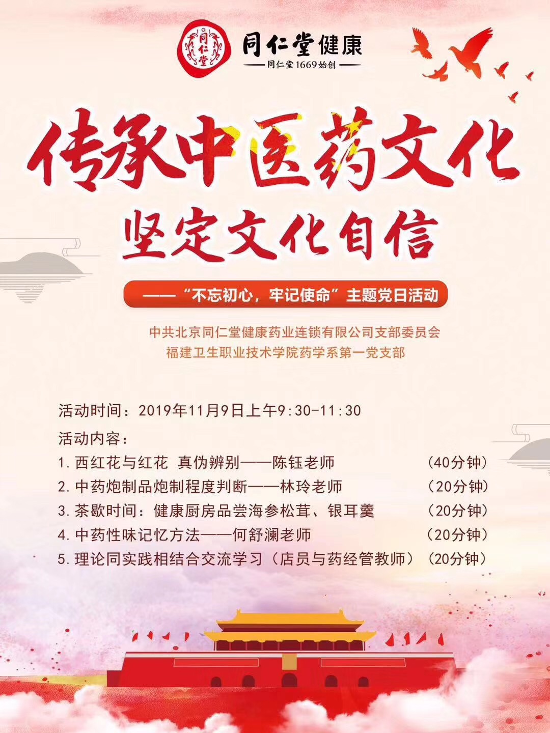 11月9日,一場別開生面的主題黨日活動在北京同仁堂福建藥業(yè)連鎖有限公司福州南星商城藥店拉開帷幕。本次黨日活動的主題是“傳承中醫(yī)藥文化,堅定文化自信”,學(xué)院紀(jì)委游鋒書記和藥學(xué)系黨總支鄭力宏書記蒞臨現(xiàn)場,藥學(xué)系第一黨支部全體黨員、北京同仁堂福建藥業(yè)連鎖有限公司的黨員代表和一線員工到場參加。