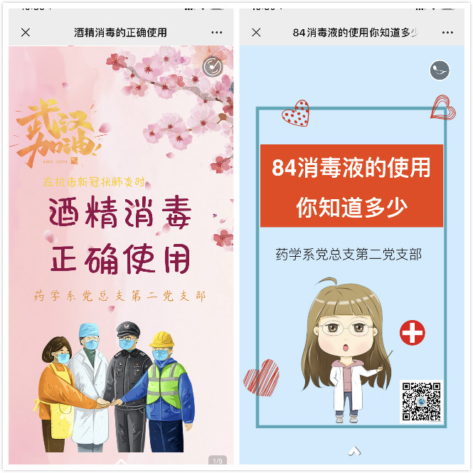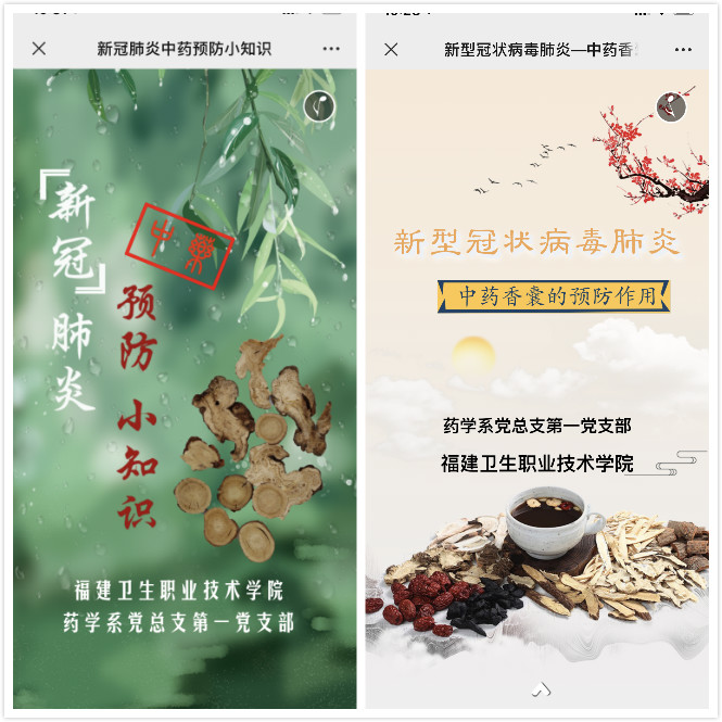 “防范疫情必須要重視中醫(yī)藥發(fā)揮的作用,尤其是中醫(yī)藥在新冠病毒感染早期、恢復(fù)期的重要作用,既要避免全盤否定中醫(yī)藥治療作用的論調(diào),也要避免病急亂投醫(yī),亂服雙黃連口服液,板藍(lán)根沖劑等現(xiàn)象的出現(xiàn),所以我們有義務(wù)向師生宣傳這方面的知識,后續(xù)我們還將繼續(xù)更新防疫法規(guī)等內(nèi)容。”藥學(xué)系第一黨支部書記,“雙帶頭人”何舒瀾副教授說。支部黨員和入黨積極分子參與防疫宣傳工作的熱情很高,有幾個H5從任務(wù)下達(dá)到成品驗(yàn)收就1天時間,高效率的背后其實(shí)也充滿了不易:支部黨員林玲、鄭煒,入黨積極分子張麗華,她們都是兩個孩子的母親,支部組織委員陳鈺的丈夫是一線醫(yī)務(wù)人員,孩子又較小,她們都只有等晚上孩子睡下才有時間開始工作,可在任務(wù)面前她們卻從不推諉,運(yùn)用專業(yè)特長開展防疫宣傳,表現(xiàn)出較高的思想覺悟。
