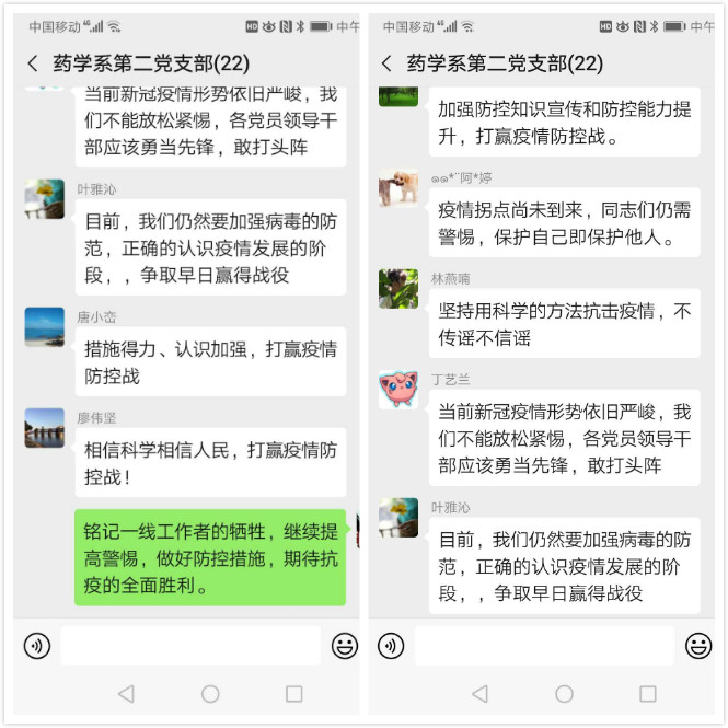 隨后,支部黨員結(jié)合個人工作實際展開發(fā)言。大家紛紛表示要致敬前線醫(yī)療行業(yè)的勇士們,牢記入黨誓詞,充分發(fā)揮黨員的先鋒模范作用,立足本職崗位,積極參與院系疫情防控工作,做到不負(fù)初心,不負(fù)誓言!