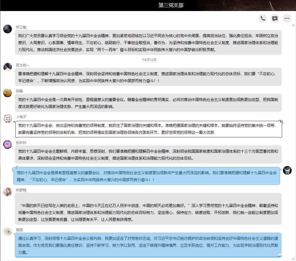 為更好地學習貫徹黨的十九屆四中全會精神、更深刻地理解新時代中國特色社會主義內(nèi)涵、致力國家治理體系和治理能力現(xiàn)代化事業(yè)發(fā)展,3月5日下午,藥學系學生黨支部通過QQ平臺開展線上主題黨日活動,集體學習黨的十九屆四中全會審議通過的《中共中央關(guān)于堅持和完善中國特色社會主義制度 推進國家治理體系和治理能力現(xiàn)代化若干重大問題的決定》全文。