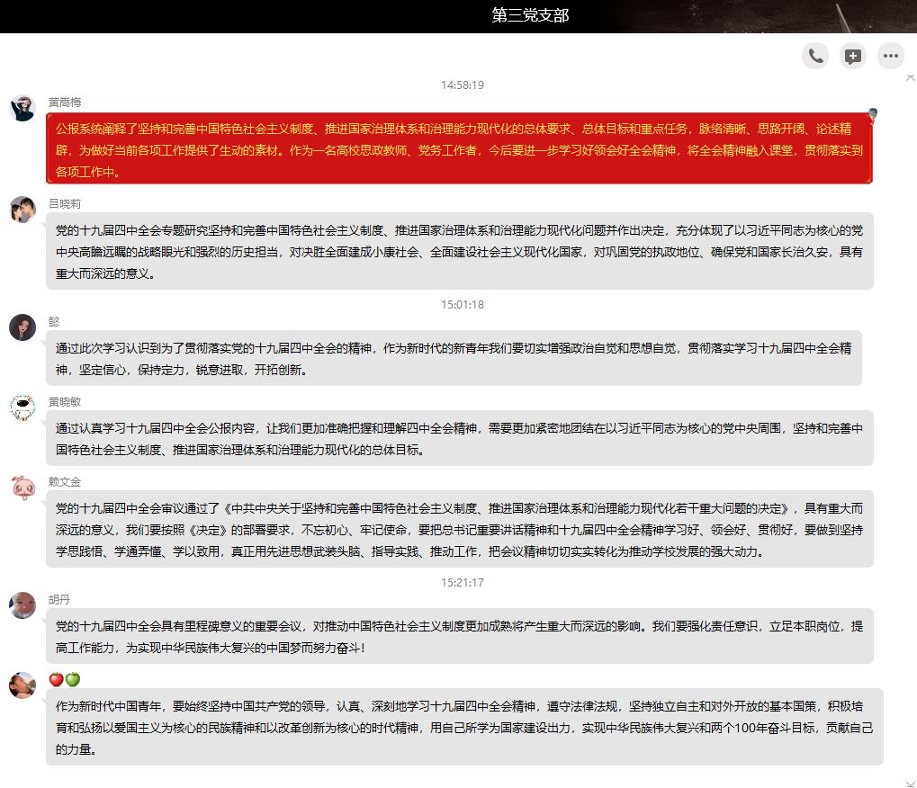 通過本次集中學習,支部全體黨員的思想覺悟再一次接受洗禮,全體師生黨員紛紛表示,作為黨務工作者、思政教師、學生代表,定將按照《決定》的部署要求,不忘初心、牢記使命,把全會精神、《決定》精神學習好、領(lǐng)會好、貫徹好,堅持學思踐悟、學通弄懂、學以致用,真正用先進思想武裝頭腦、指導實踐、推動學習工作,為國家治理體系和治理能力現(xiàn)代化建設(shè)貢獻力量。