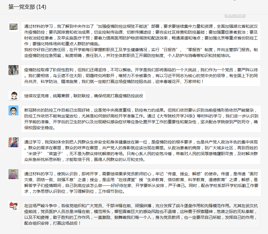 黨員同志表示通過材料的學(xué)習(xí),認(rèn)識(shí)到新冠肺炎的防控工作目前呈現(xiàn)向好趨勢,但我們依然要清醒認(rèn)識(shí)到當(dāng)前疫情形勢依然嚴(yán)峻復(fù)雜,防控工作依然不能有絲毫放松,尤其是如何做好學(xué)院開學(xué)前后準(zhǔn)備工作。通過《大專院校開學(xué)24條》等材料的學(xué)習(xí),我們進(jìn)一步認(rèn)識(shí)到開學(xué)前的準(zhǔn)備、開學(xué)后的衛(wèi)生防護(hù)以及出現(xiàn)疑似感染癥狀等應(yīng)急處置開學(xué)工作的重要性和復(fù)雜性,作為黨員,我們將堅(jiān)決配合學(xué)院做到嚴(yán)防死守,確保校園安全穩(wěn)定。