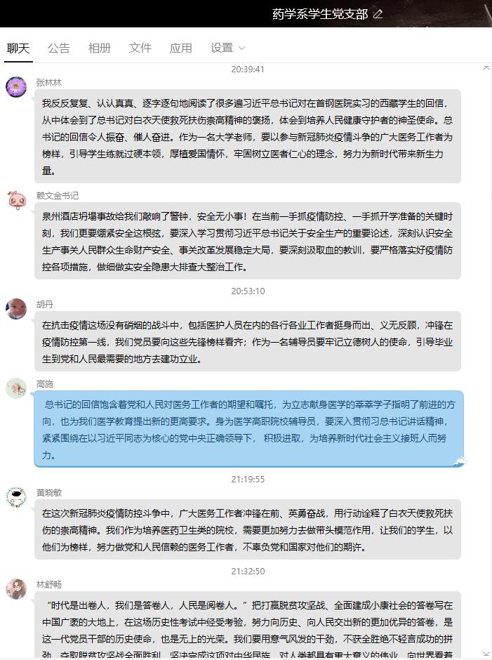 在一手抓疫情防控、一手抓開學(xué)準(zhǔn)備的關(guān)鍵時刻,3月21日晚,藥學(xué)系學(xué)生黨支部通過QQ平臺集中學(xué)習(xí)中共中央辦公廳《黨委(黨組)落實全面從嚴(yán)治黨主體責(zé)任規(guī)定》《新時代高等學(xué)校思想政治理論課教師隊伍建設(shè)規(guī)定》,習(xí)近平總書記給在首鋼實習(xí)的西藏學(xué)生的回信、在脫貧攻堅座談會上的講話等文件及我省關(guān)于泉州市欣佳酒店坍塌事故處置和安全隱患大排查大整治的省委常委會會議精神。