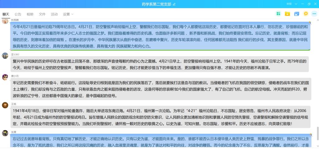 支部書記鄧元榮同志在QQ群中發(fā)布文檔資料,支部成員通過文字與圖片回顧了福州兩次淪陷的歷史。鄧元榮同志強(qiáng)調(diào)歷史看似已經(jīng)過去,但它卻融在我們生活的這個國家和社會的血液中,歷史需要被銘記。重溫這段慘痛的歷史,它提醒我們:勿忘國恥,保衛(wèi)祖國 ,珍愛和平,在慘痛中得到教訓(xùn),振興我中華。