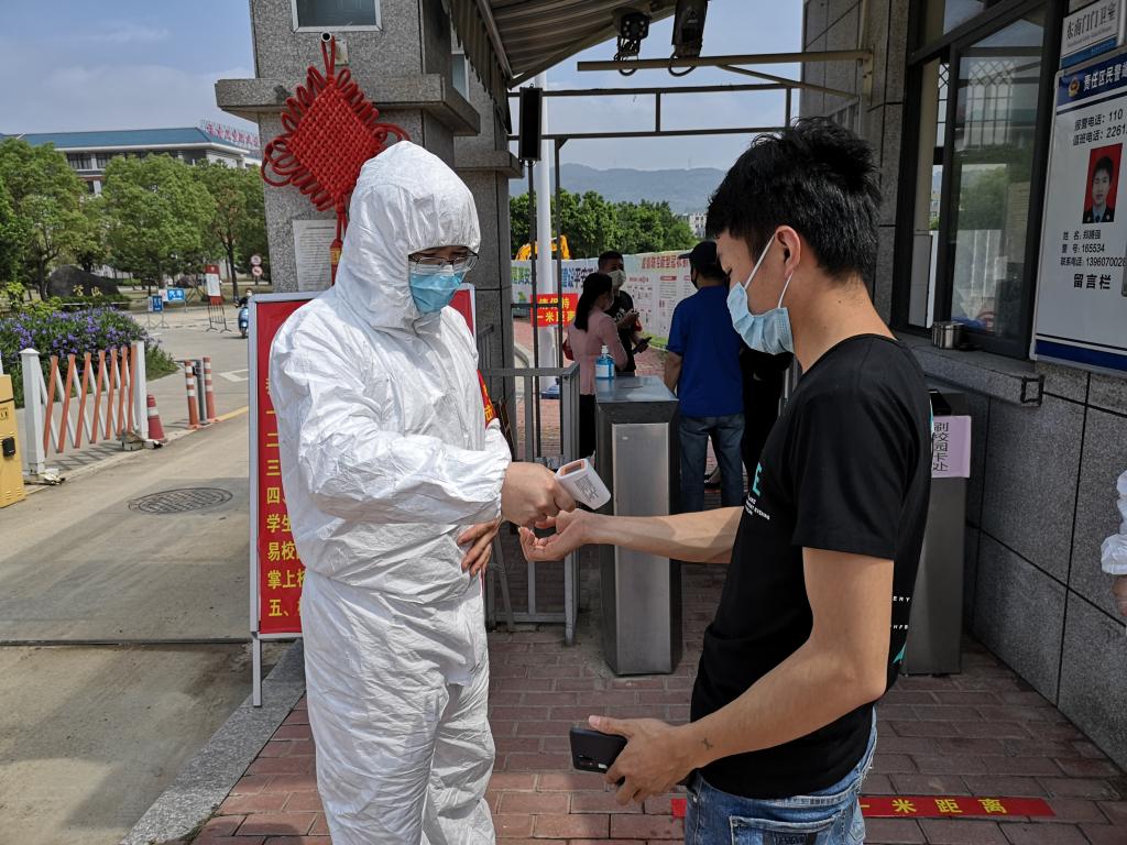 鄧元榮老師對(duì)入校學(xué)生進(jìn)行體溫監(jiān)測(cè)