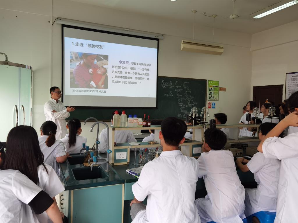 課上,肖健副主任圍繞學(xué)院校友在戰(zhàn)“疫”過程中涌現(xiàn)出的感人事跡、學(xué)院全體同仁在防“疫”關(guān)頭表現(xiàn)出的有效落實兩方面展開闡述。他強(qiáng)調(diào)新冠疫情爆發(fā)以來,我院許許多多校友奮戰(zhàn)在抗擊疫情的第一線,他們臨危受命,放棄春節(jié)休假,與時間賽跑,與疫情抗?fàn)?,以實際行動踐行著“業(yè)精德誠”的校訓(xùn)精神,踐行著醫(yī)生誓言。他表示,希望同學(xué)們努力學(xué)習(xí),在學(xué)好專業(yè)知識的基礎(chǔ)上,不斷強(qiáng)化技能,今后為醫(yī)學(xué)事業(yè)的發(fā)展貢獻(xiàn)個人力量。