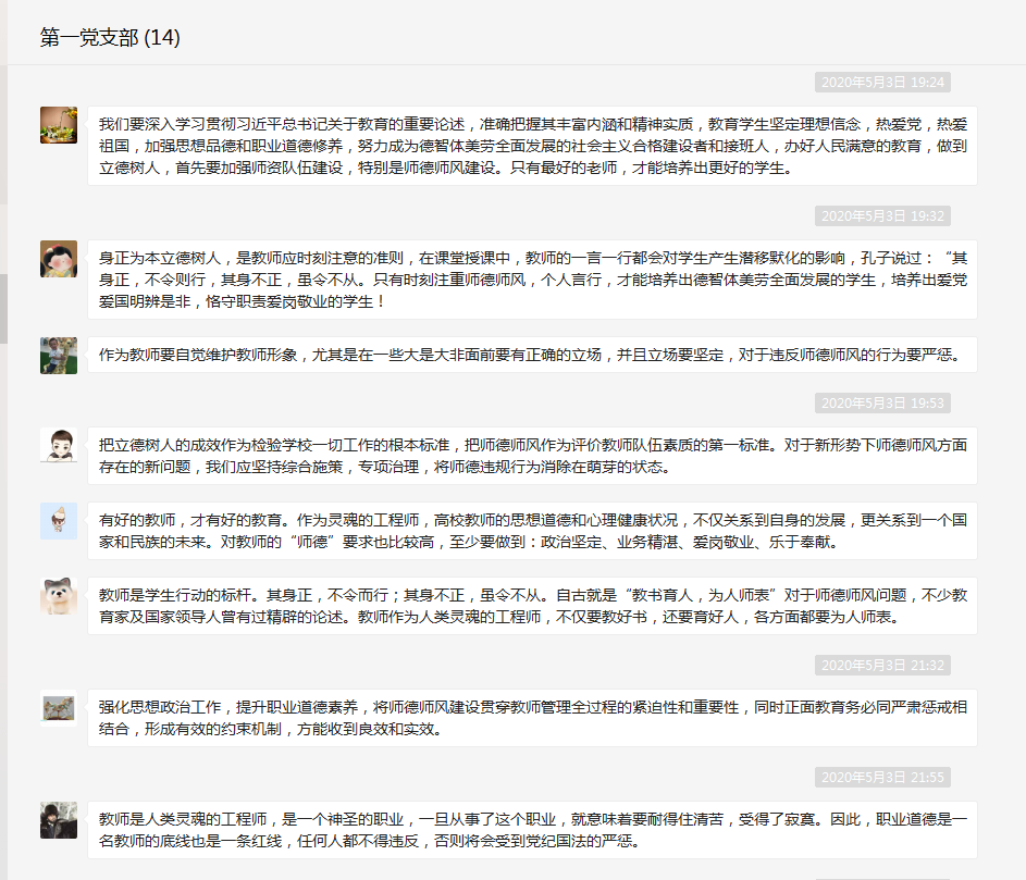 2020年5月3日,藥學(xué)系第一黨支部通過(guò)微信群在線開(kāi)展師德師風(fēng)建設(shè)學(xué)習(xí)活動(dòng),本次支部活動(dòng)恰逢五一小長(zhǎng)假,黨員同志在休息的同時(shí)不忘學(xué)習(xí),認(rèn)真研讀了《加強(qiáng)師德建設(shè)當(dāng)堅(jiān)持失責(zé)必問(wèn)》、《教育部強(qiáng)調(diào)師德師風(fēng)第一標(biāo)準(zhǔn):嚴(yán)重違規(guī)者將終身禁教》兩篇文章?;顒?dòng)由支部書(shū)記何舒瀾主持。