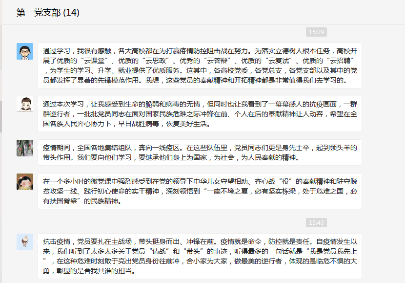 通過觀看微黨課,支部黨員更加增強“四個意識”,堅決做到“兩個維護”,以堅定的遠大理想、過硬的本領(lǐng)素質(zhì)、強烈的責(zé)任擔(dān)當(dāng),為系部師生的教學(xué)科研做好服務(wù),讓黨旗始終在防控疫情斗爭中高高飄揚。
