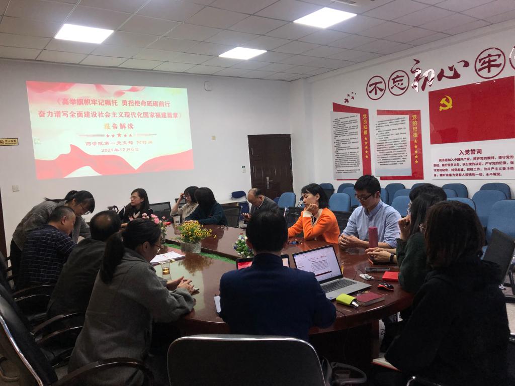 2021年12月16日,藥學(xué)院第一黨支部書(shū)記何舒瀾在藥學(xué)院會(huì)議室為支部黨員開(kāi)展福建省第十一次黨代會(huì)精神專題黨課。