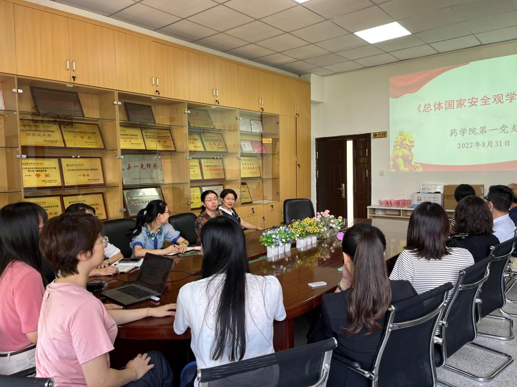 為深入學(xué)習(xí)貫徹習(xí)近平總書記總體國家安全觀,2022年8月31日,藥學(xué)院第一黨支部在藥學(xué)院會議室開展主題黨日活動,全體黨員到場學(xué)習(xí),活動由支部書記羅蘭主持。
