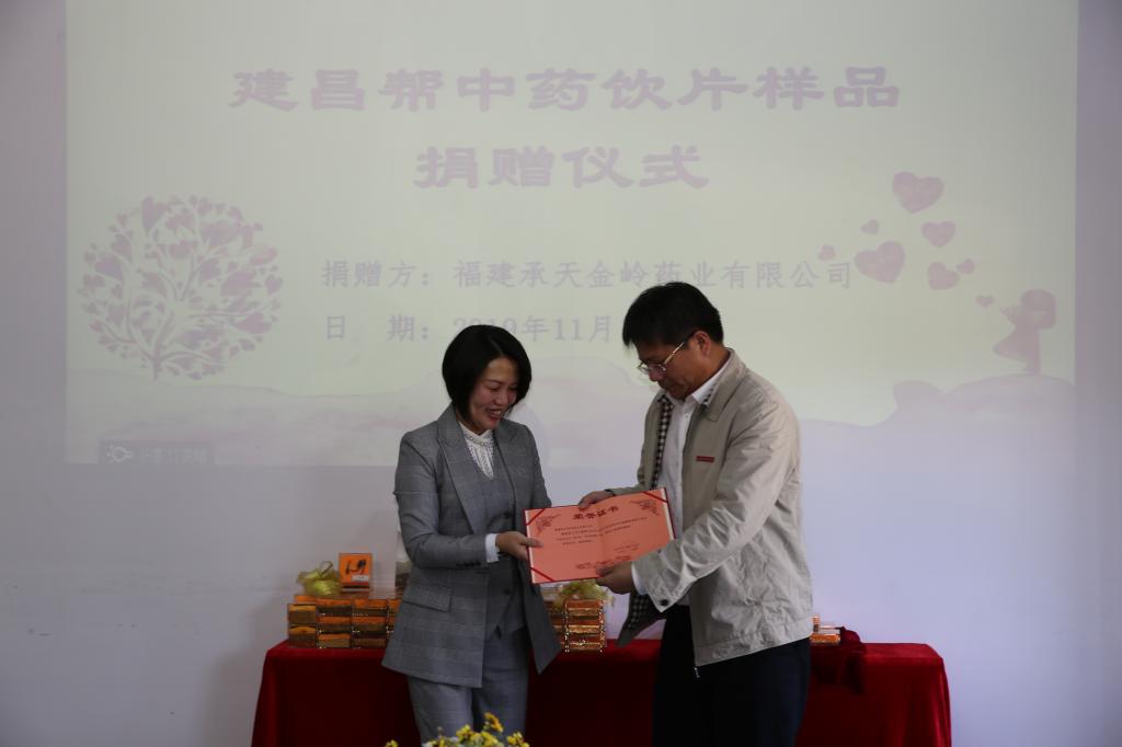 捐贈(zèng)儀式上,福建承天金嶺藥業(yè)有限公司代表謝瑞華副總經(jīng)理向我校捐贈(zèng)“建昌幫”中藥炮制標(biāo)本100份,蘇友新校長(zhǎng)為謝瑞華副總經(jīng)理頒發(fā)了捐贈(zèng)證書。