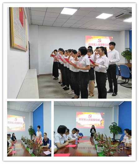 儀式在莊嚴的國際歌中拉開序幕,總支委員、系副主任潘雪豐老師宣讀新黨員名單?!拔抑驹讣尤胫袊伯a黨,擁護黨的綱領,遵守黨的章程,履行黨員義務.....”16名新黨員佩戴黨員徽章并進行集體宣誓。新黨員面向黨旗,舉起右手,跟隨領誓人陳瑜老師,莊嚴向黨旗宣誓,表達對黨的忠誠、為共產主義事業(yè)奮斗終身的決心。