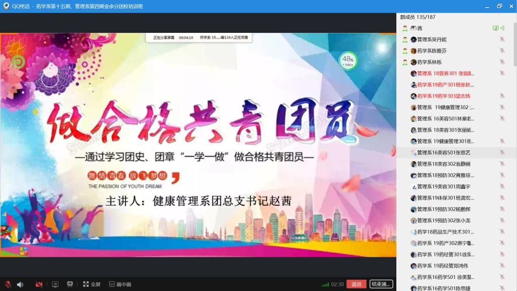 2020年3月12日,為提升廣大青年團員醫(yī)學生的綜合素質,健康管理系團總支書記趙茜老師為藥學系第十五期、管理系第四期業(yè)余分團校的學員們講授主題為“做合格共青團員”專題團課。