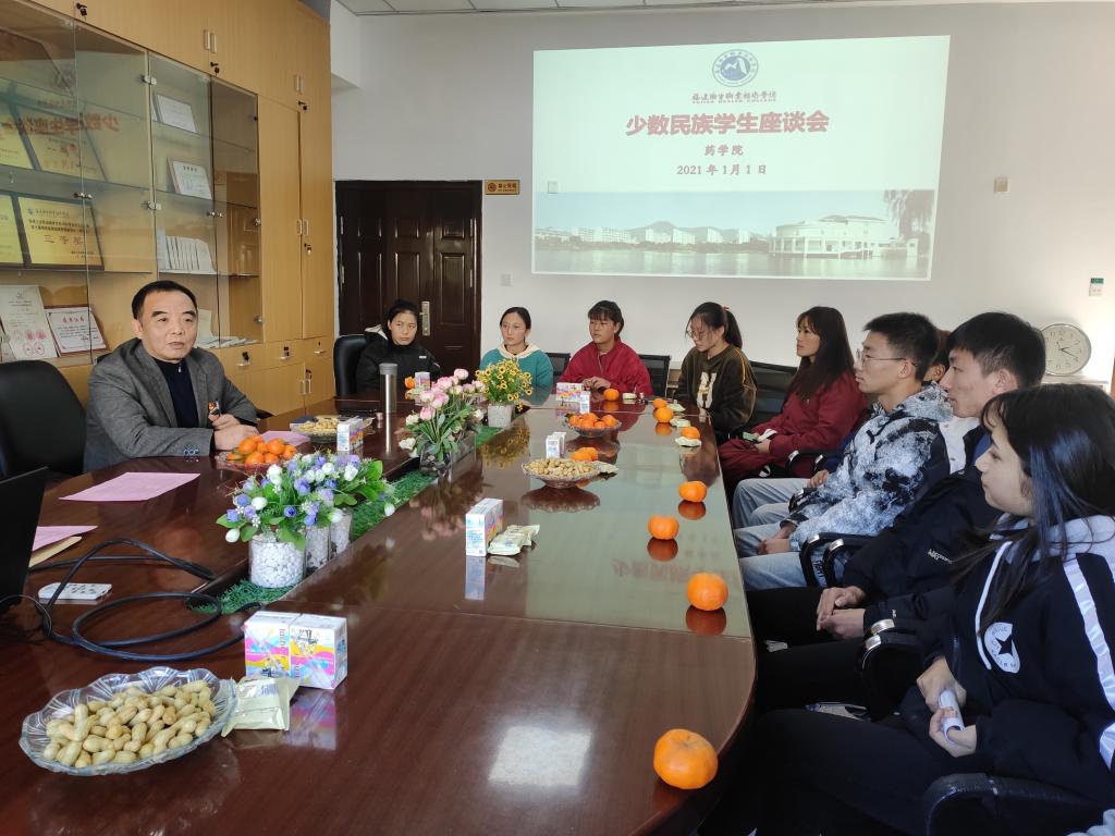 為貫徹落實(shí)《新時(shí)代愛國(guó)主義教育實(shí)施綱要》精神,加強(qiáng)對(duì)學(xué)生的民族團(tuán)結(jié)教育,做好少數(shù)民族學(xué)生的教育管理服務(wù)工作,藥學(xué)院于2021年1月1日下午在207會(huì)議室召開少數(shù)民族學(xué)生座談會(huì)。學(xué)校紀(jì)委游鋒書記,藥學(xué)院黨總支鄭力宏書記以及11名藏族、維吾爾族、仡佬族學(xué)生出席了座談,黨總支賴文金副書記主持座談。