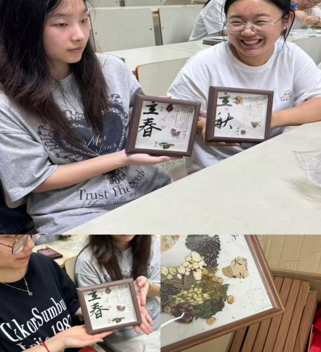 活動(dòng)圍繞“識本草、制畫品、傳心意”三大環(huán)節(jié)展開。“節(jié)氣本草識”環(huán)節(jié),同學(xué)間交流與“二十四節(jié)氣”相關(guān)的草本植物特性,如立春的辛夷、立秋的菊花等;“畫品手作”環(huán)節(jié),同學(xué)們精選各類草本藥材,巧妙搭配成“立春”“立秋”等節(jié)氣主題的本草畫,也將對心理健康的期許融入創(chuàng)作。同學(xué)們專注于藥材擺放、裝裱,在沉浸式創(chuàng)作中釋放壓力,每一幅本草畫都成為獨(dú)一無二的心靈載體。