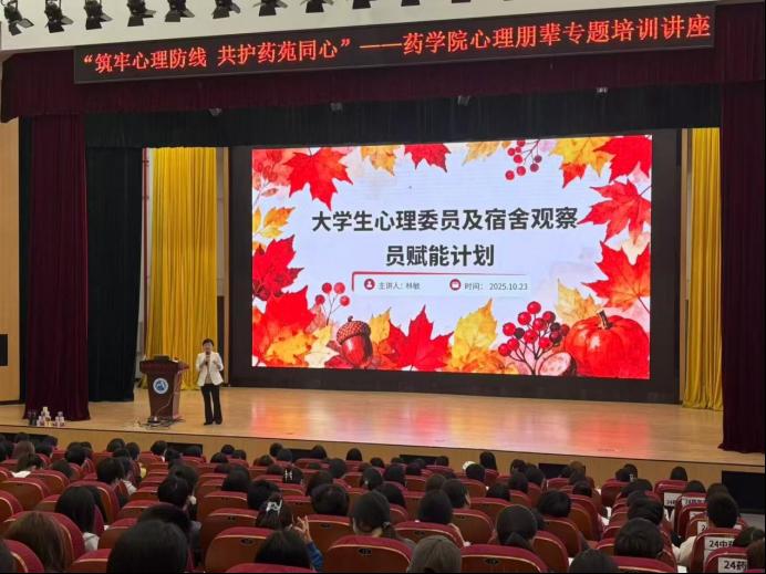 10月23日,藥學(xué)院邀請了福州大學(xué)心理學(xué)專家林敏老師到校開展以“筑牢心理防線,共護(hù)藥苑同心”為主題的心理朋輩專題培訓(xùn)講座,藥學(xué)院全體心理委員、宿舍觀察員及心理朋輩志愿者共400余人參加。