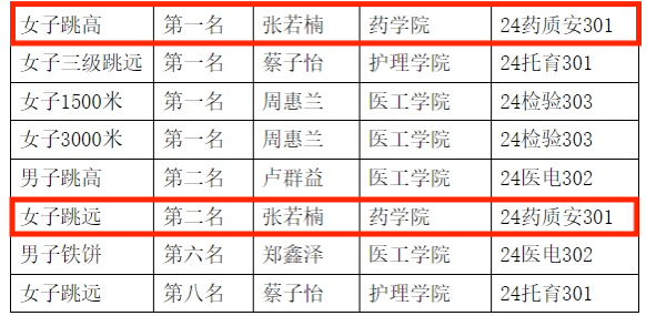 來自藥學(xué)院24藥品質(zhì)量與安全專業(yè)的張若楠同學(xué)在體育部唐圣老師的悉心指導(dǎo)下認(rèn)真?zhèn)鋺?zhàn)、刻苦訓(xùn)練,賽場(chǎng)上不畏強(qiáng)手、勇于拼搏,經(jīng)過激烈角逐,分別在女子跳高和女子跳遠(yuǎn)兩個(gè)賽項(xiàng)中斬獲個(gè)人1金1銀的佳績。