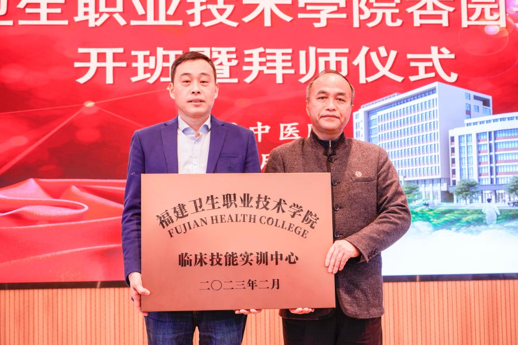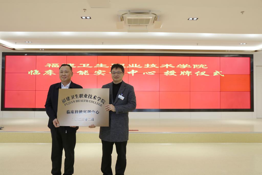 校黨委書記曾武祈(左)與福州市中醫(yī)院院長楊曉煜(右)共同為“臨床技能實訓(xùn)中心”揭牌授牌