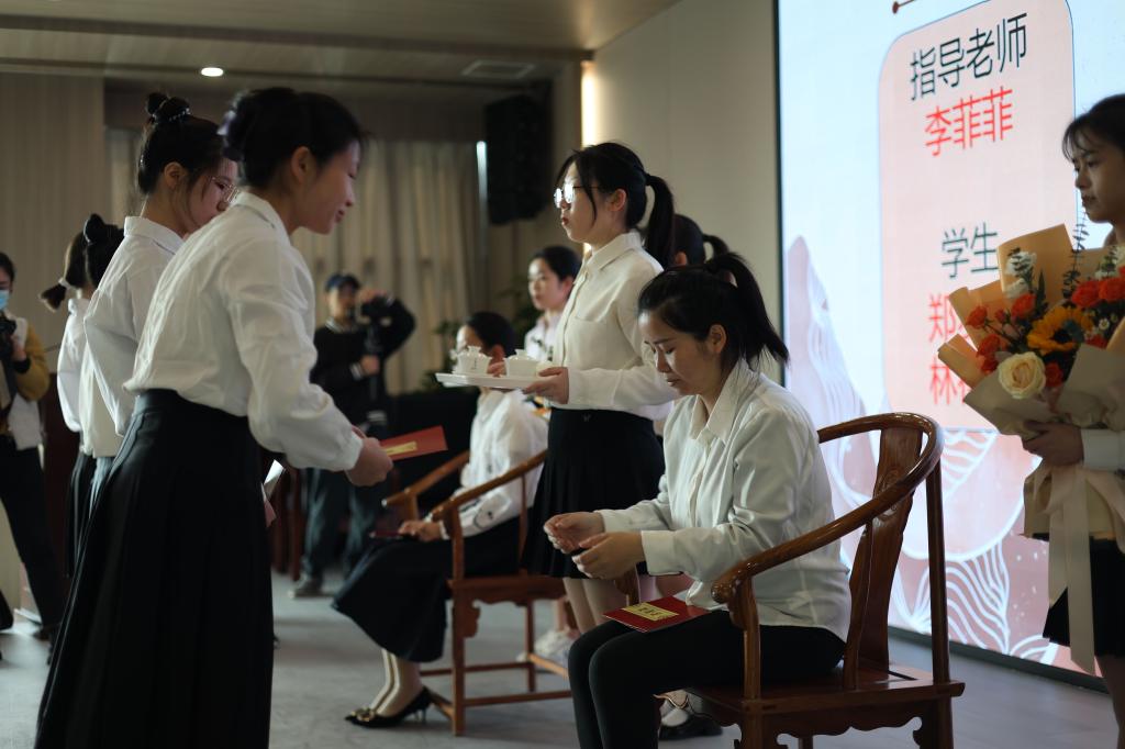 拜師儀式上,學(xué)生們按照傳統(tǒng)中醫(yī)學(xué)徒拜師禮儀,分別向各自導(dǎo)師呈拜師帖、奉茶、獻花、鞠躬行禮。